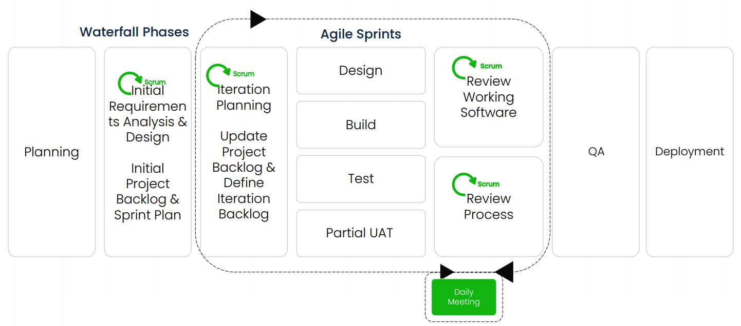 • We follow a hybrid agile approach focusing on designs and specifications and then breaking tasks into sprints which include design and refinement processes. Our approach takes the best from an Agile approach and is best suited to a ROI driven approach to automation.